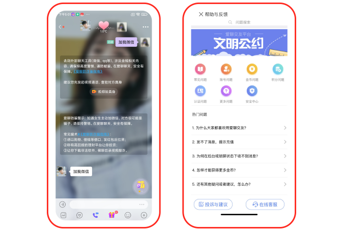 在严厉打击诈骗行为方面,针对“杀猪盘”“虚拟币投资加线下交易”等各类层出不穷的诈骗手段与新型骗局,爱聊升级了多项针对性风控策略与预警机制,并针对缅北赌诈地区用户实行重点排查与违法违规账号打击专项行动。本年度,爱聊封禁诈骗账号10369例。